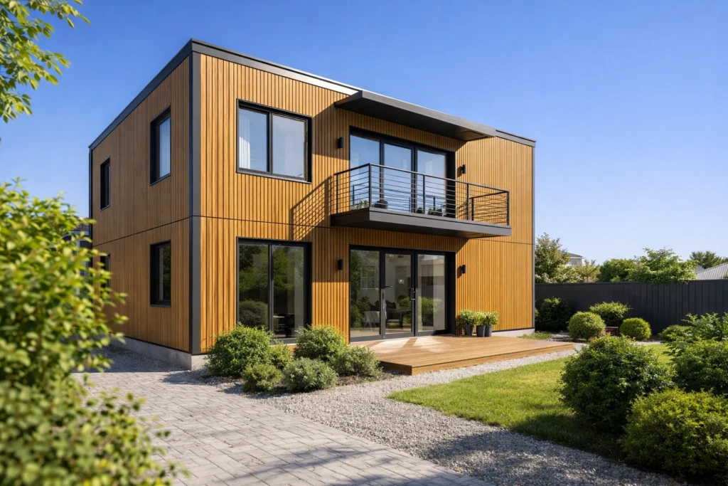 Nu. Este o construcție prefabricată, proiectată ca o clădire reală (locuință sau spațiu comercial), nu un container de marfă „amenajat”. Diferența stă în structură, izolație și durabilitate.